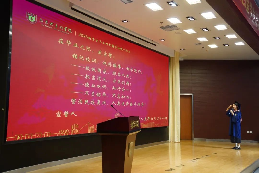 铿锵誓言,拳拳初心。全体毕业生在尹紫琦同学的带领下庄严宣誓:“铭记校训:诚朴雄伟,励学敦行。报效国家、服务人民,担当道义、守正创新,德业双修、知行合一,不负韶华、不忘初心,誓为民族复兴、人类进步奋斗终身!”