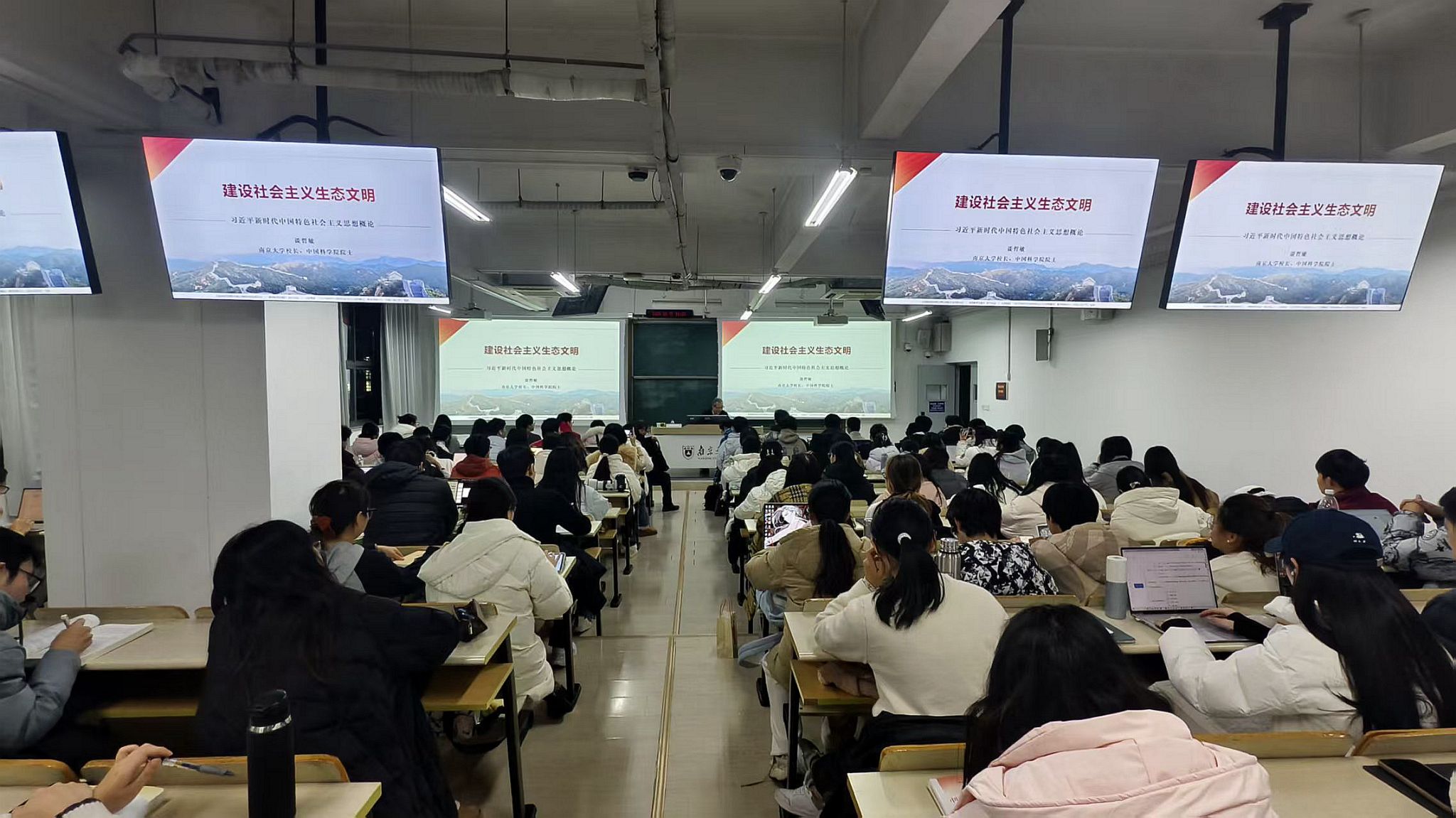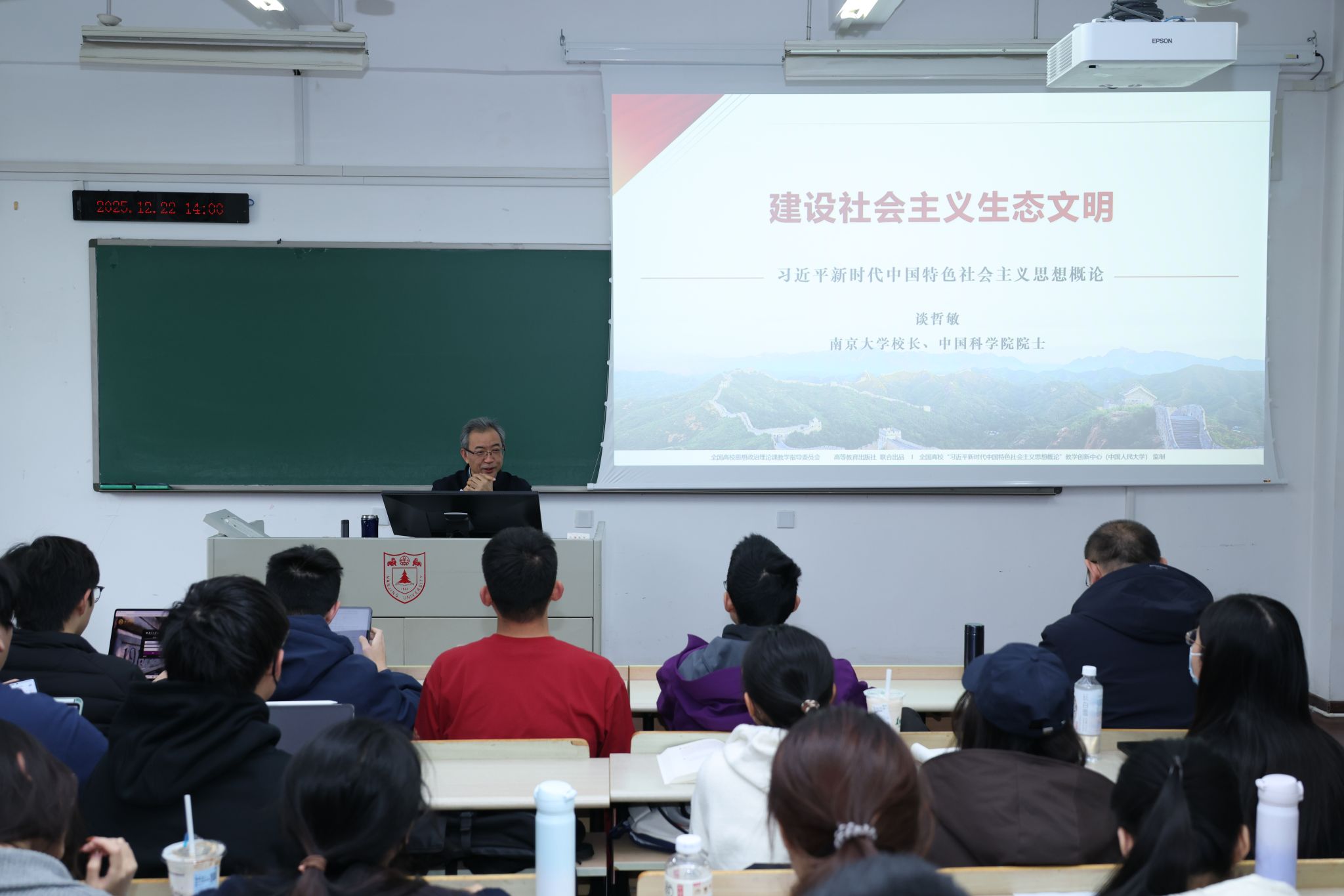校长、中国科学院院士谈哲敏走进“习近平新时代中国特色社会主义思想概论”课堂,在仙林校区以“建设社会主义生态文明”为题,为来自哲学学院、商学院、海外教育学院等多个学院的2024级本科同学们讲授了内涵丰富、思想深刻的思政课。