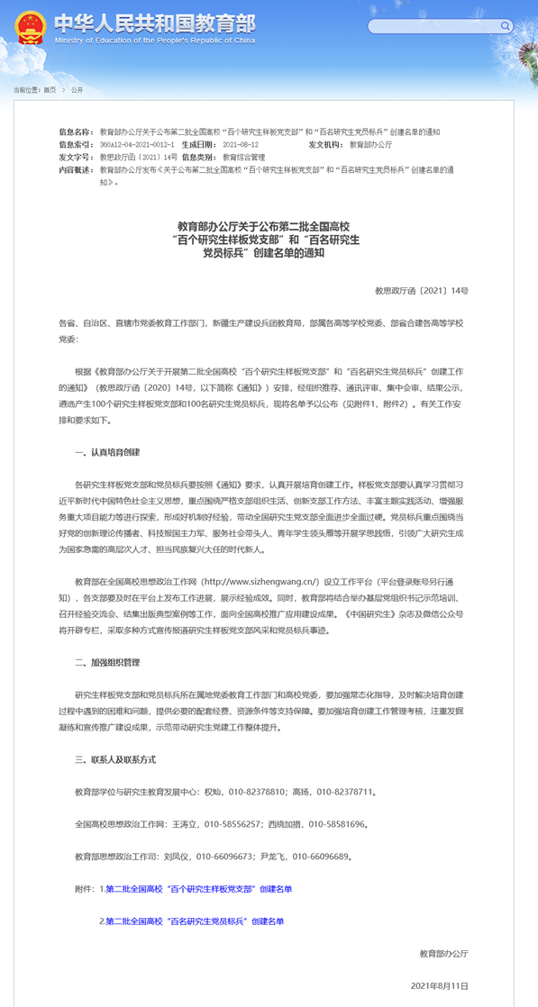 研究生第二党支部入选第二批全国高校“百个研究生样板党支部”。
