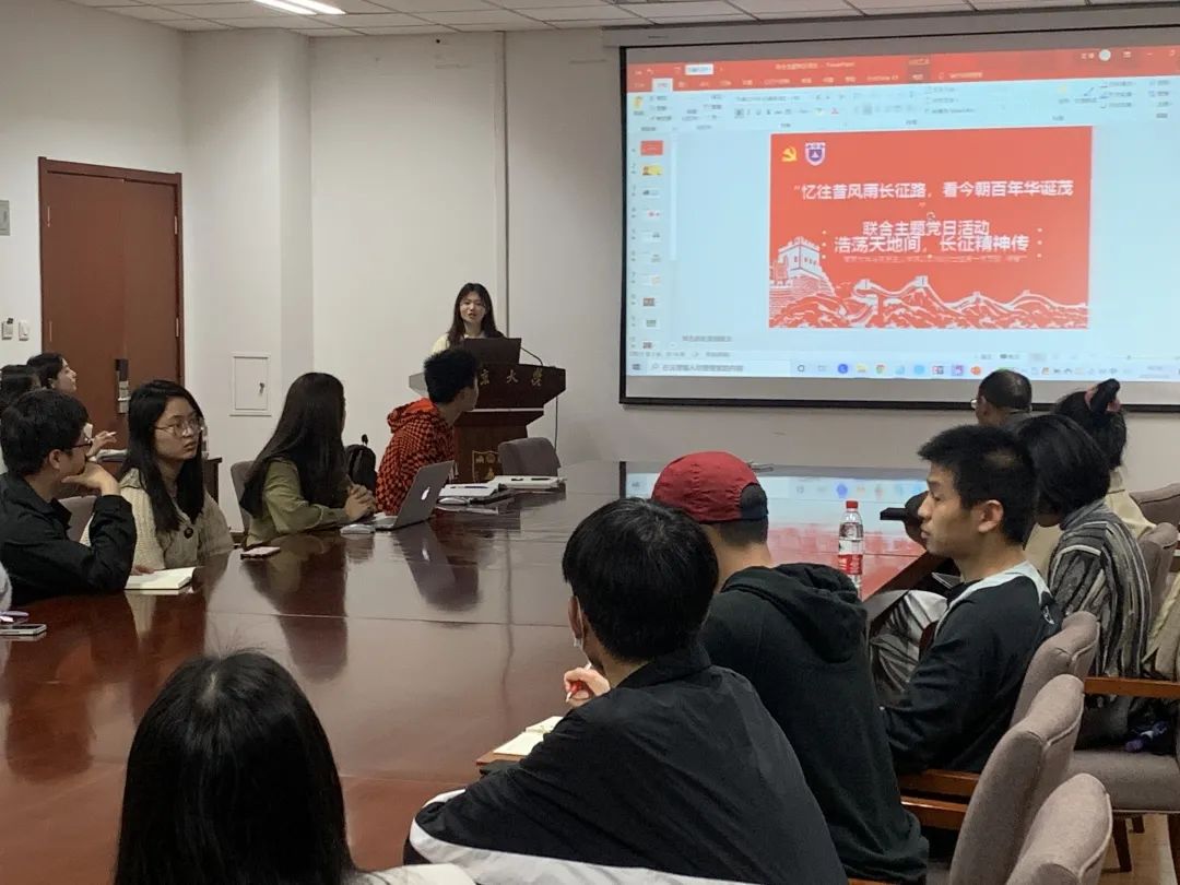 研究生第一党支部、第二党支部、2020级第一党支部同地理与海洋科学学院20硕自然党支部于昆山楼会议室537开展“忆往昔风雨长征路,看今朝百年华诞茂”联合主题党日活动。本次主题党日活动由地理与海洋科学学院20硕自然党支部书记黄雪滢同志主持,四个支部的党员同志参与本次活动。