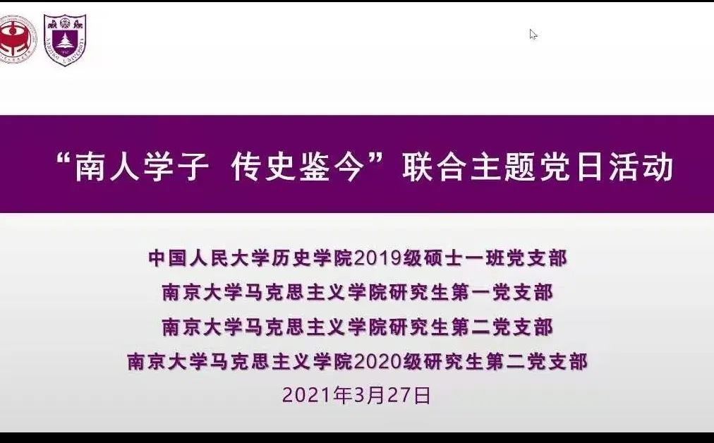 研究生第一、二党支部、2020级研究生第二党支部与中国人民大学历史学院2019级硕士生一班党支部开展“南人学子 传史鉴今”线上联合主题党日活动,韩漫