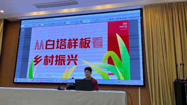 2021级本科生团支部成员蔡恺翔同学以《从白塔样板看乡村振兴》为题展开分享交流。他从白塔村样本引入,从产业兴旺、生态宜居、乡风文明、治理有效和生活富裕五个方面展开对白塔村乡村振兴的路径进行了深入的探究。接着,韩漫