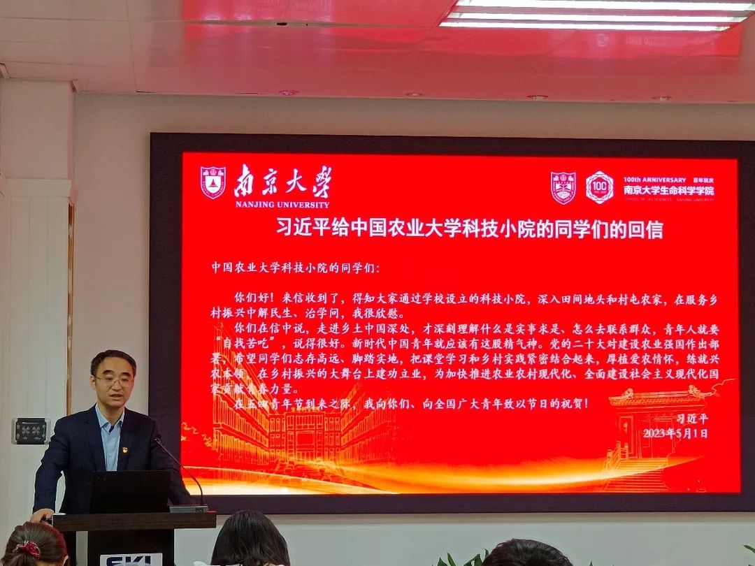 生命科学学院党委书记纪勇以“以奋进姿态激扬青春梦想”为题,领学“习近平给中国农业大学科技小院的同学们的回信”精神。他强调,青年要牢记习近平总书记的谆谆教诲,树立“祖国至上的担当”“人民至上的情怀”“科学至上的理想”“生命至上的信念”,用脚步丈量祖国大地、用眼睛发现中国精神、用耳朵倾听人民呼声、用内心感应时代脉搏,把对祖国血浓于水、与人民同呼吸共命运的情感贯穿始终,并融汇在人生追求中!