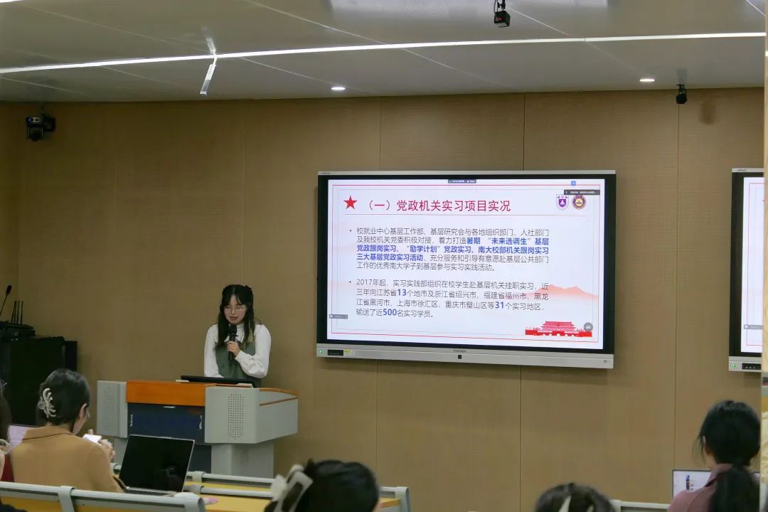 首先,由姜兴黔同学进行暑期党政机关实习项目介绍。校就业中心基层工作部、基层研究会与各地组织部门、人社部门及我校机关党委积极对接,着力打造暑期 “未来选调生”基层党政跟岗实习、“励学计划”党政实习、南大校部机关跟岗实习三大基层党政实习活动,充分服务和引导有意愿赴基层公共部门工作的优秀南大学子到基层参与实习实践活动。