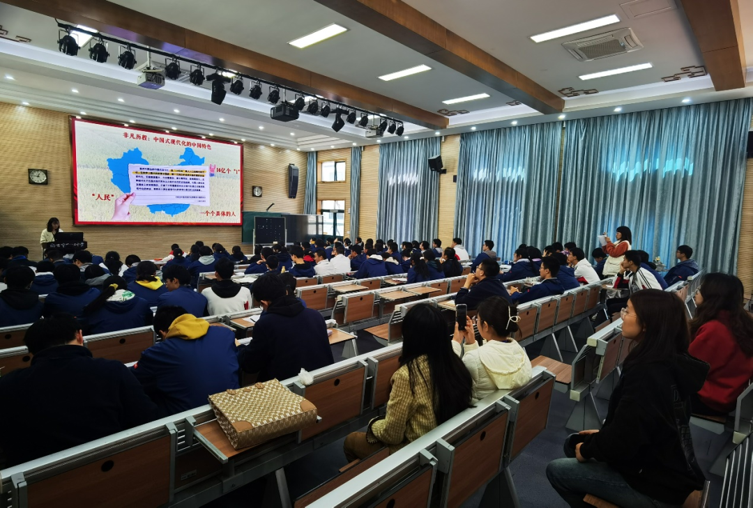 首先,丛政带领同学们系统回顾了中国式现代化的探索历程。在这场征途中,既有凯歌行进的高潮,也有曲折盘旋的艰辛。从工业化到四个现代化、从中国化的现代化表述再到中国式现代化,这一系列演变,既体现了中国共产党和中国人民的勇于进取,又反映了一切从实际出发、遵循客观规律的实事求是。所有的探索,所有的奋斗,最后都告诉我们这样一个历史结论:走自己的路。