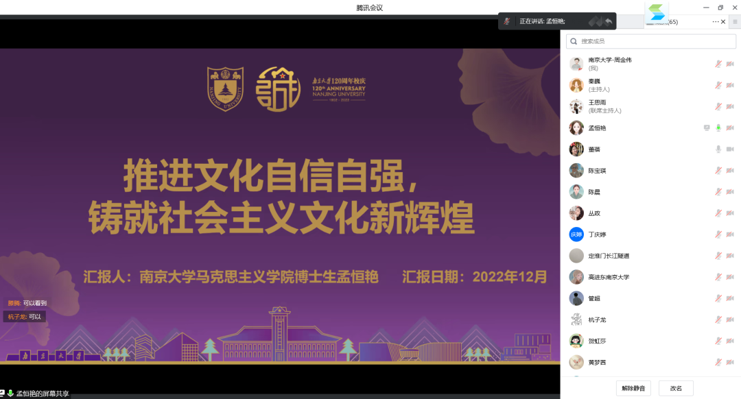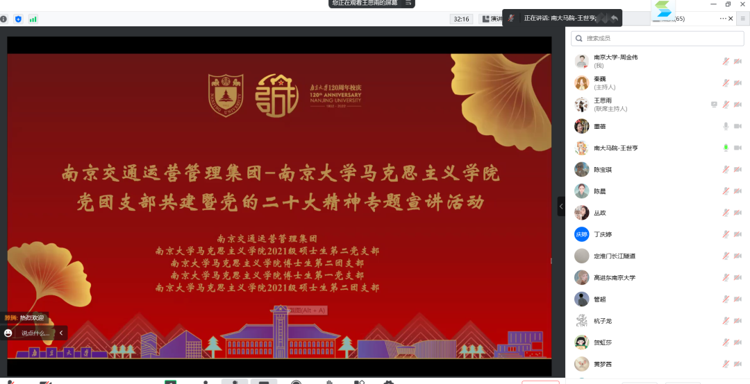 2021级硕士生第二党支部、博士生第一党支部、博士生第二团支部、2021级硕士生第二团支部与南京交通运营管理集团(以下简称:运管集团)以线上形式开展了党团支部共建暨党的二十大精神专题宣讲活动,双方单位60余名党团员青年相聚云端参加本次活动。活动分共建合作和专题宣讲两个环节,分别由运管集团党群工作部主任、团总支书记董蓓和韩漫