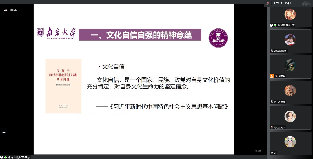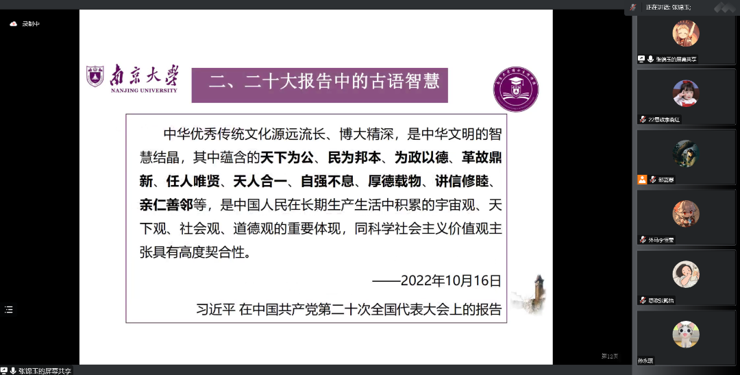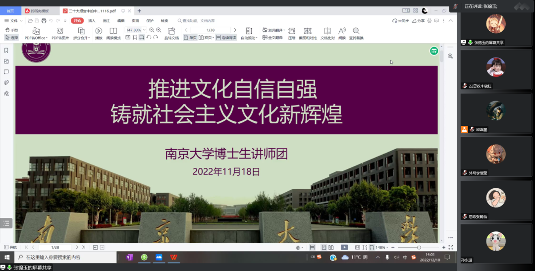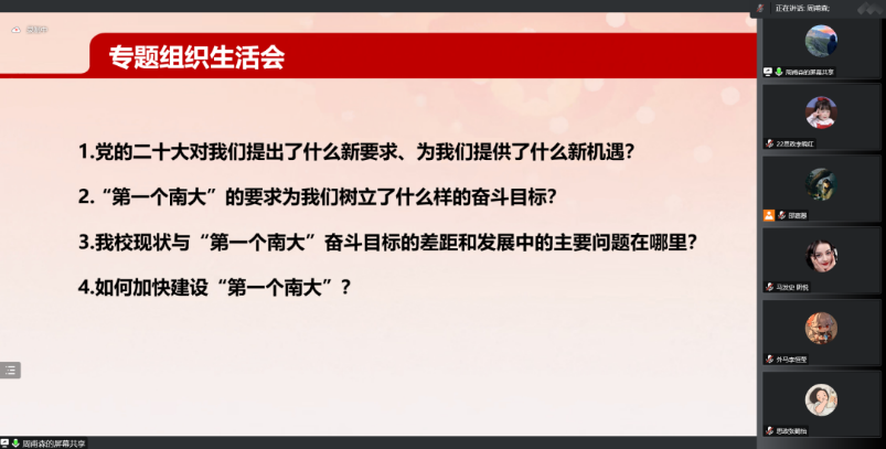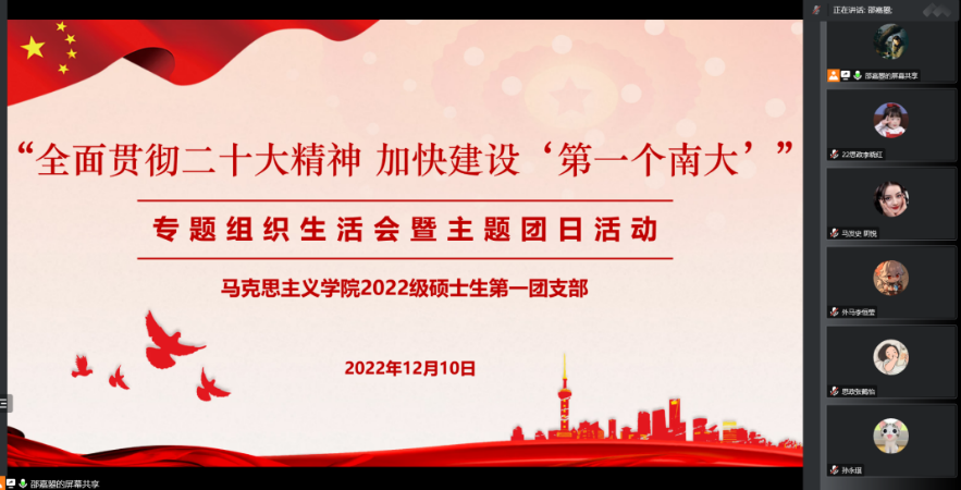 2022级硕士生第一团支部开展“全面贯彻二十大精神 加快建设‘第一个南大’”专题组织生活会暨主题团日活动,通过全员参与、广开言路,聚焦问题、建言献策,充分讨论、集思广益,不断增强共青团组织引领力、组织力、服务力,进一步引领班级青年参与建设有中国特色、南大特质、时代特点的“第一个南大”。本次活动采用线上形式,由2022级硕士生第一团支部书记邵嘉曌、副书记周甫森、组织委员张睿思共同主持,韩漫