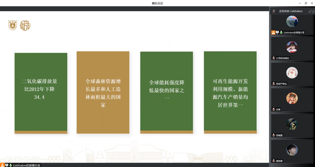 随后,周甫森同学为大家细数近十年来中国生态文明建设的伟大成就:二氧化碳排放量比2012年下降了34.4%,全国地级及以上城市PM2.5平均浓度较2015年下降34.8%,截至2021年森林面积和森林蓄积量连续保持“双增长”等等,为大家徐徐展开了一幅美丽中国画卷。