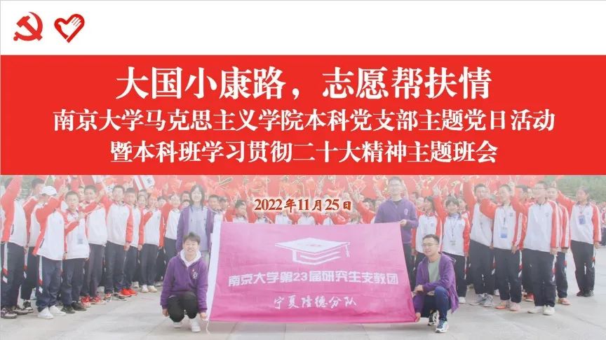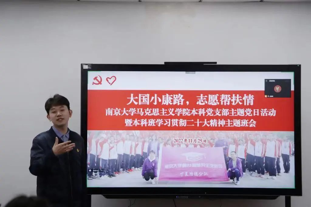 本科生党支部联合2021级本科生团支部开展“大国小康路·志愿帮扶情”学习党的二十大精神主题党团日活动。外国语学院博士生辅导员龙心悦老师、化学化工学院2021级本科生辅导员魏志老师、新生学院毓秀书院辅导员朱博阳老师、新生学院毓秀书院辅导员孙悦伦老师作为特邀嘉宾出席本次活动。整场活动由韩漫