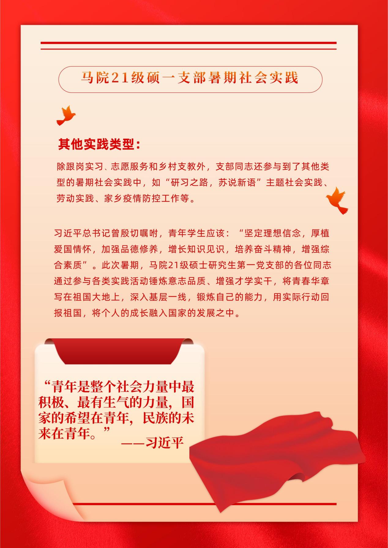 2021级硕士生第一党团支部的同志们通过跟岗实习、社会实践和乡村支教等方式深入基层一线,锻炼自己的能力,用实际行动回报祖国,将个人的成长融入国家的发展之中,用青春的昂扬姿态迎接党的二十大胜利召开。
