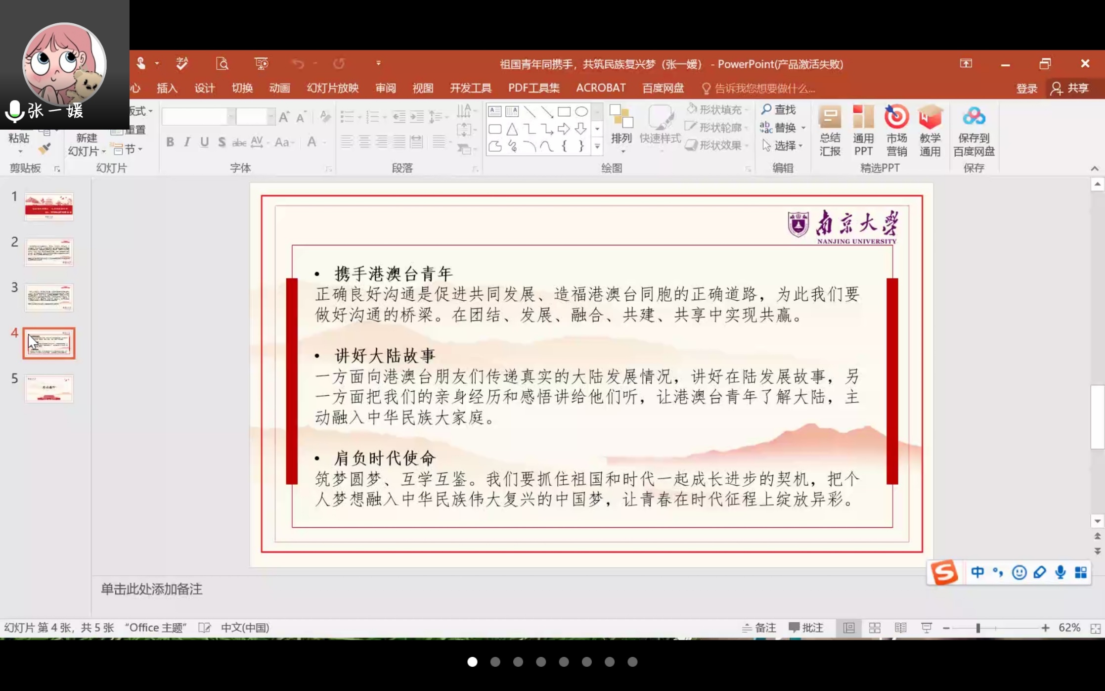 2021级硕士生第一党支部成员孙楚苏同志介绍了活动的整体流程,文学院2021级硕士生第二党支部书记张一媛同学为带领同学们进行“祖国统一,青年担当”主题学习。张一媛同学通过短视频与大家一同回顾了习近平总书记的香港之行,并重温习总书记在庆祝香港回归祖国25周年大会的讲话以及7月11日给参加海峡青年论坛的台湾青年的回信精神,她提出三点倡议:一是携手港澳台青年,做好沟通的桥梁;二是讲好大陆故事,让港澳台青年了解大陆,主动融入中华民族大家庭;三是肩负时代使命,与港澳台青年筑梦圆梦、互学互鉴,把个人梦想融入中华民族伟大复兴的中国梦,让青春在时代征程上绽放异彩。