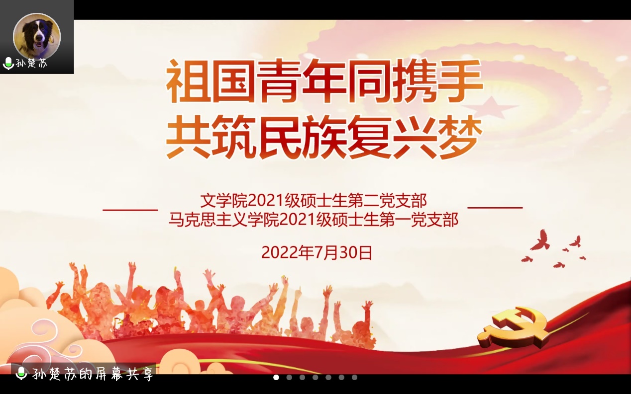 2021级硕士生第一党支部联合文学院2021级硕士生第二党支部于2022年7月30日晚七点共同开展“祖国青年同携手,共筑民族复兴梦”主题党日活动。通过讲述青年奋斗故事,展现青年理想担当,激励青年扎根祖国大地,为实现民族复兴梦而不懈奋斗。本次党日活动由韩漫