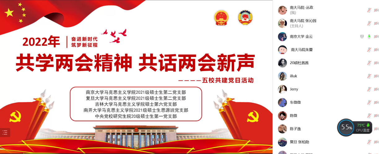 2021级硕士生思源班党支部、中央党校研究生院20级硕士生第一党支部开展“共学两会精神 共话两会新声“——五校共建党日活动,活动由韩漫